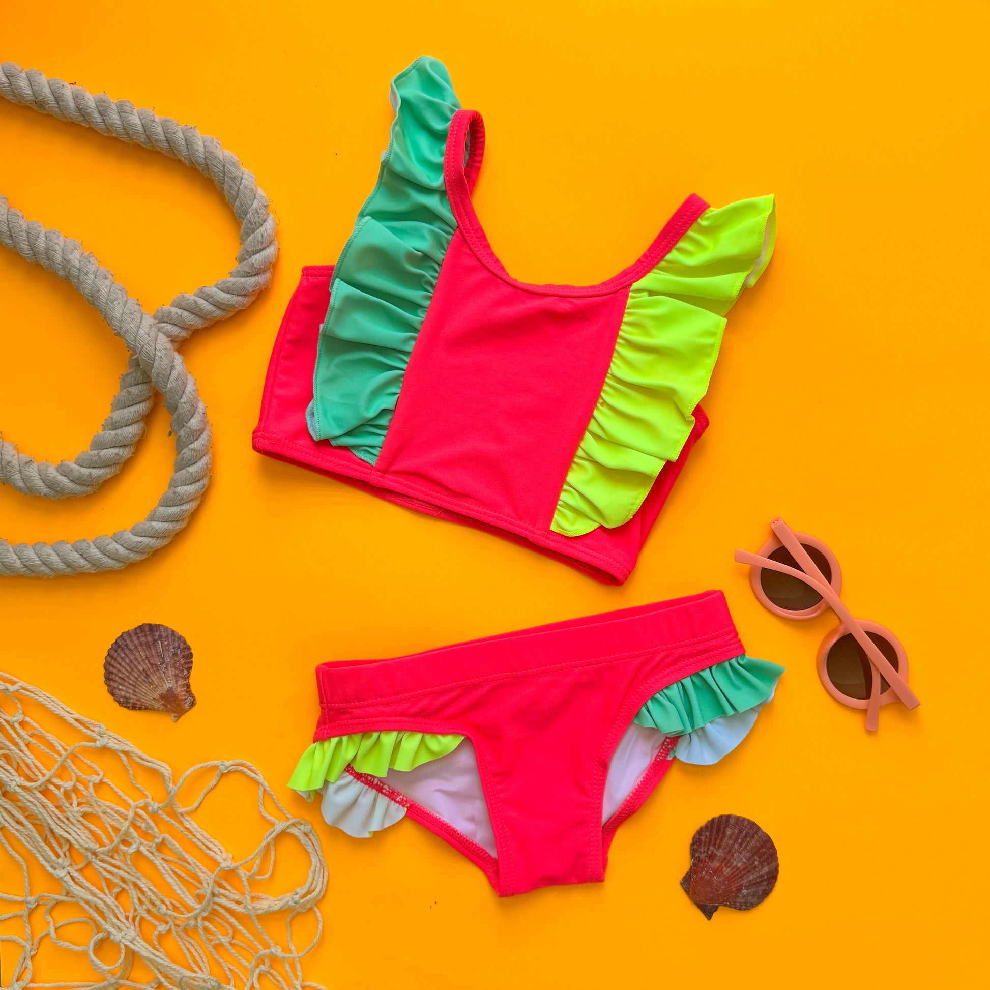 Bright, bold, and ready to make a splash, the Miami Two-Piece is a summer must-have. Featuring a vibrant pink base with playful contrast ruffle details, this sporty set is screams visibility and fun. This item runs true to size; however, some sizes are a shared size and it may feel slightly roomier than expected. We recommend staying true to size, or sizing down if you're between sizes or prefer a more fitted fit.
