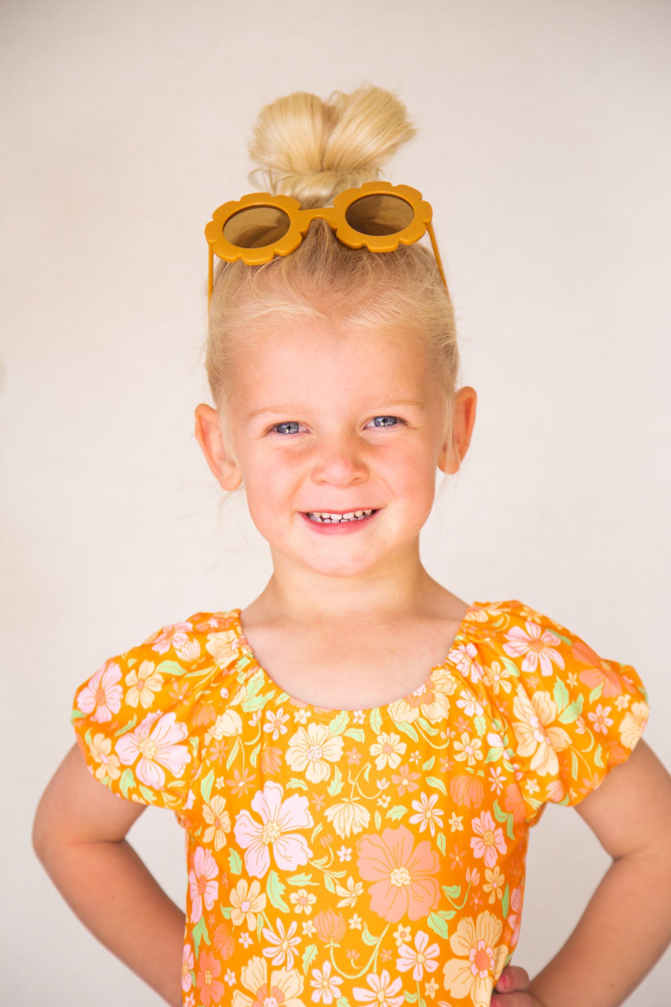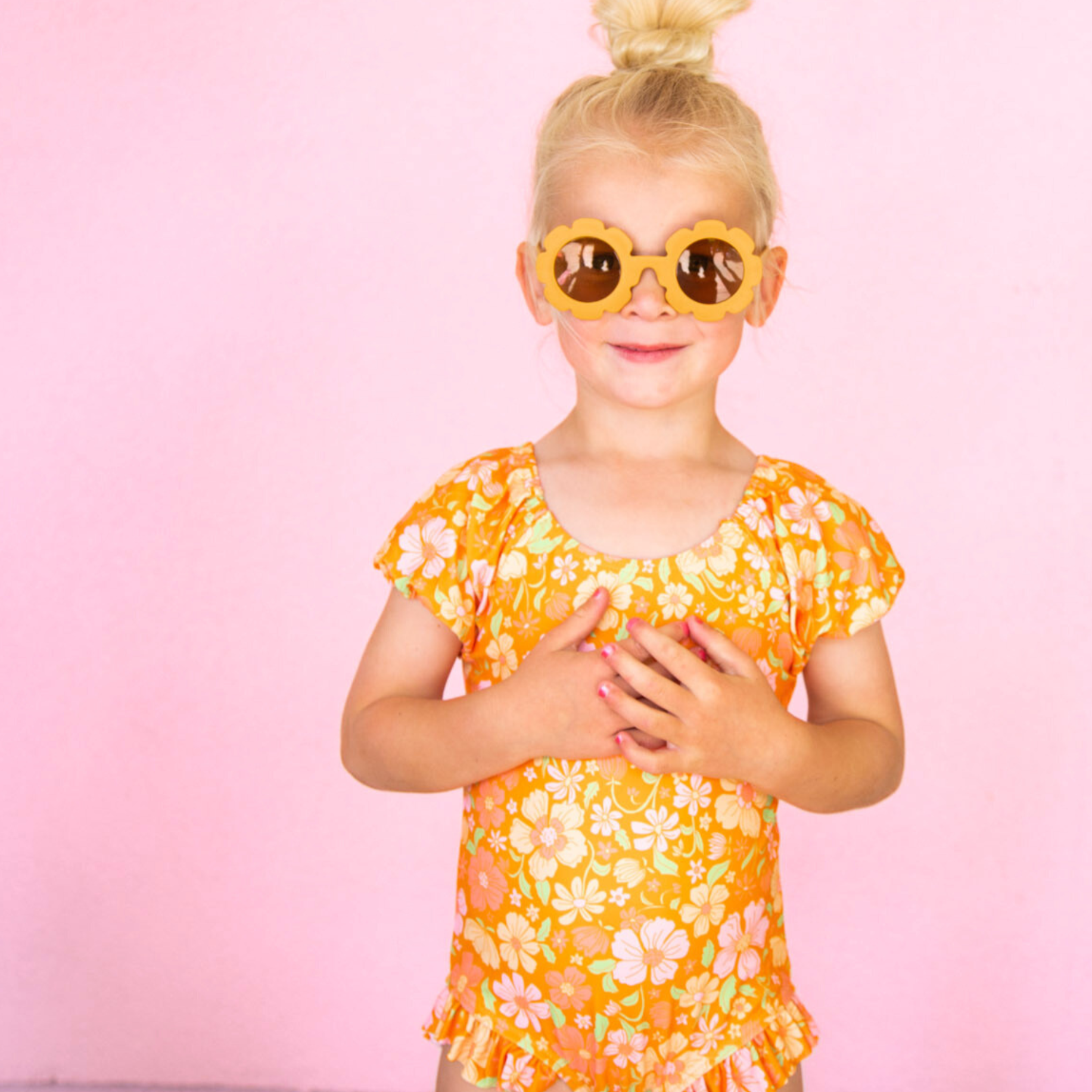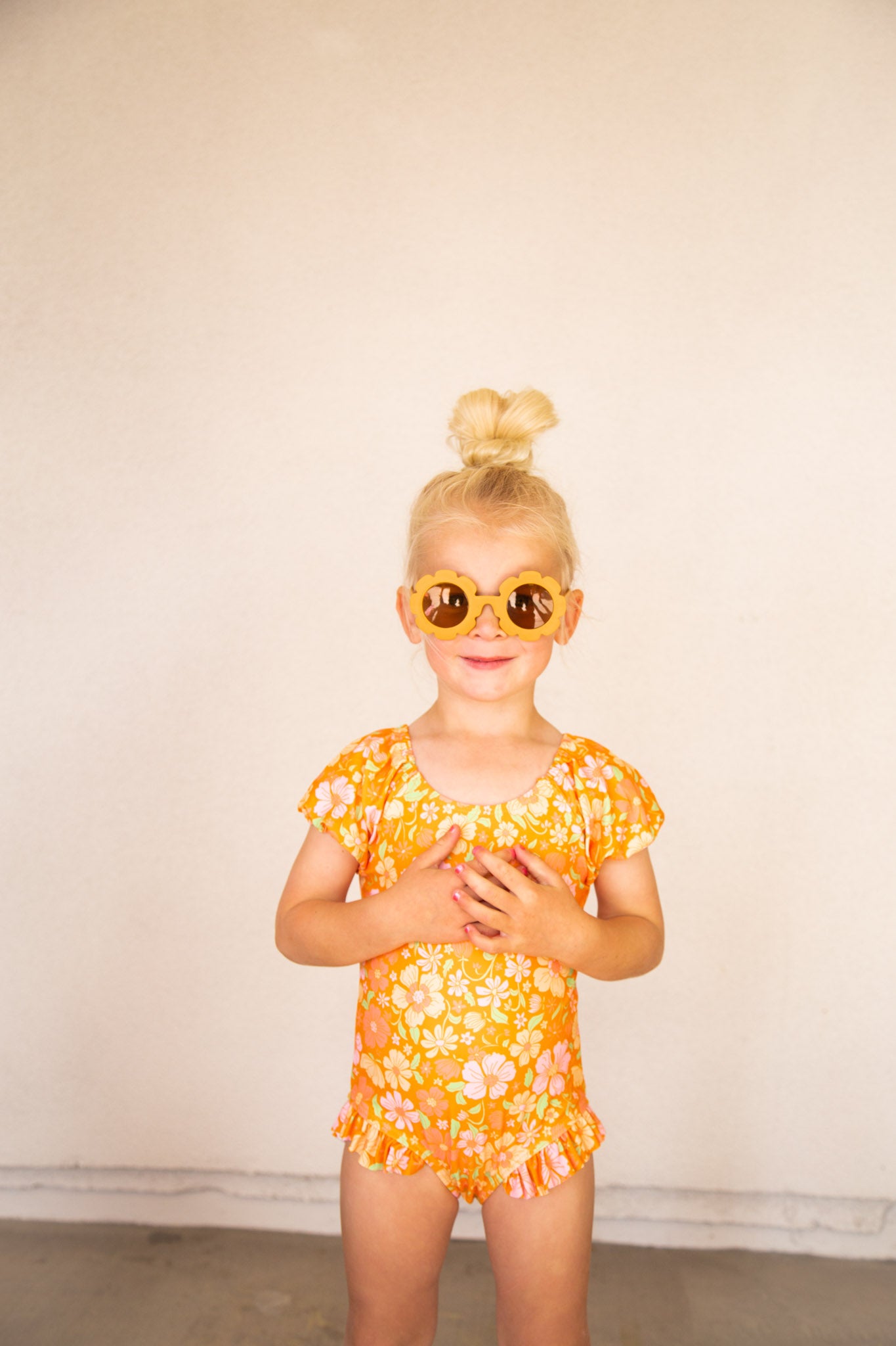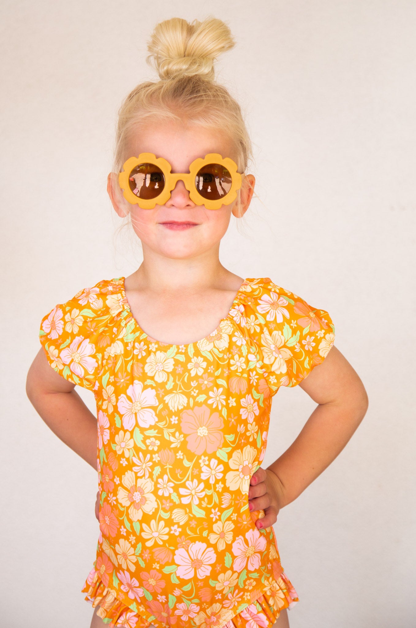 Bring a splash of sunshine with our Tropicana One-Piece! Featuring a cheerful retro floral print in warm and tropical tones. Puff sleeves add a sweet, vintage-inspired touch, and lastly, the delicate ruffle detail at the hips are the cherry on top! This item runs true to size; however, as some are a shared size, it may feel slightly roomier than expected. We recommend staying true to size, or sizing down if you're between sizes or prefer a more fitted fit.